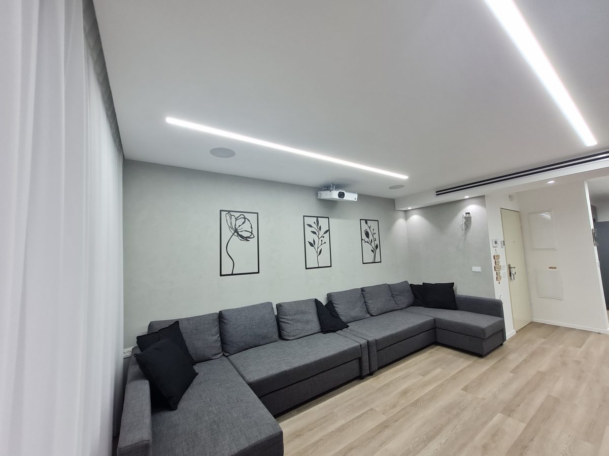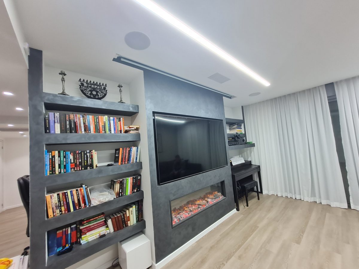 ומסך חשמלי 120" נגלל חשמלי נסתר בנישת גבס ייעודית שתכננו עבורם.