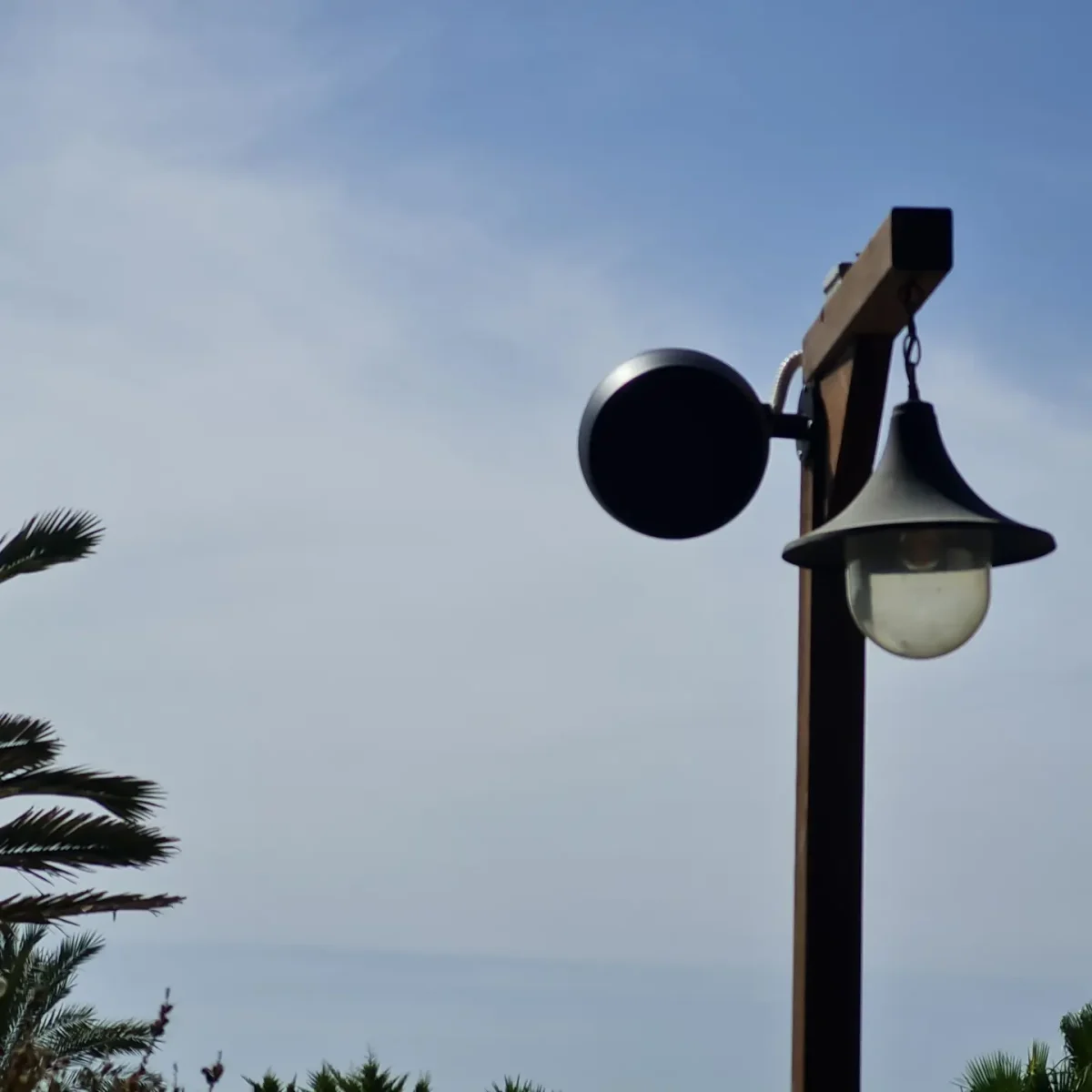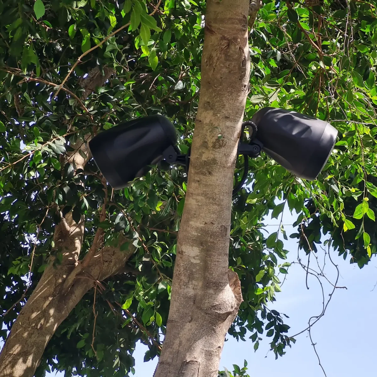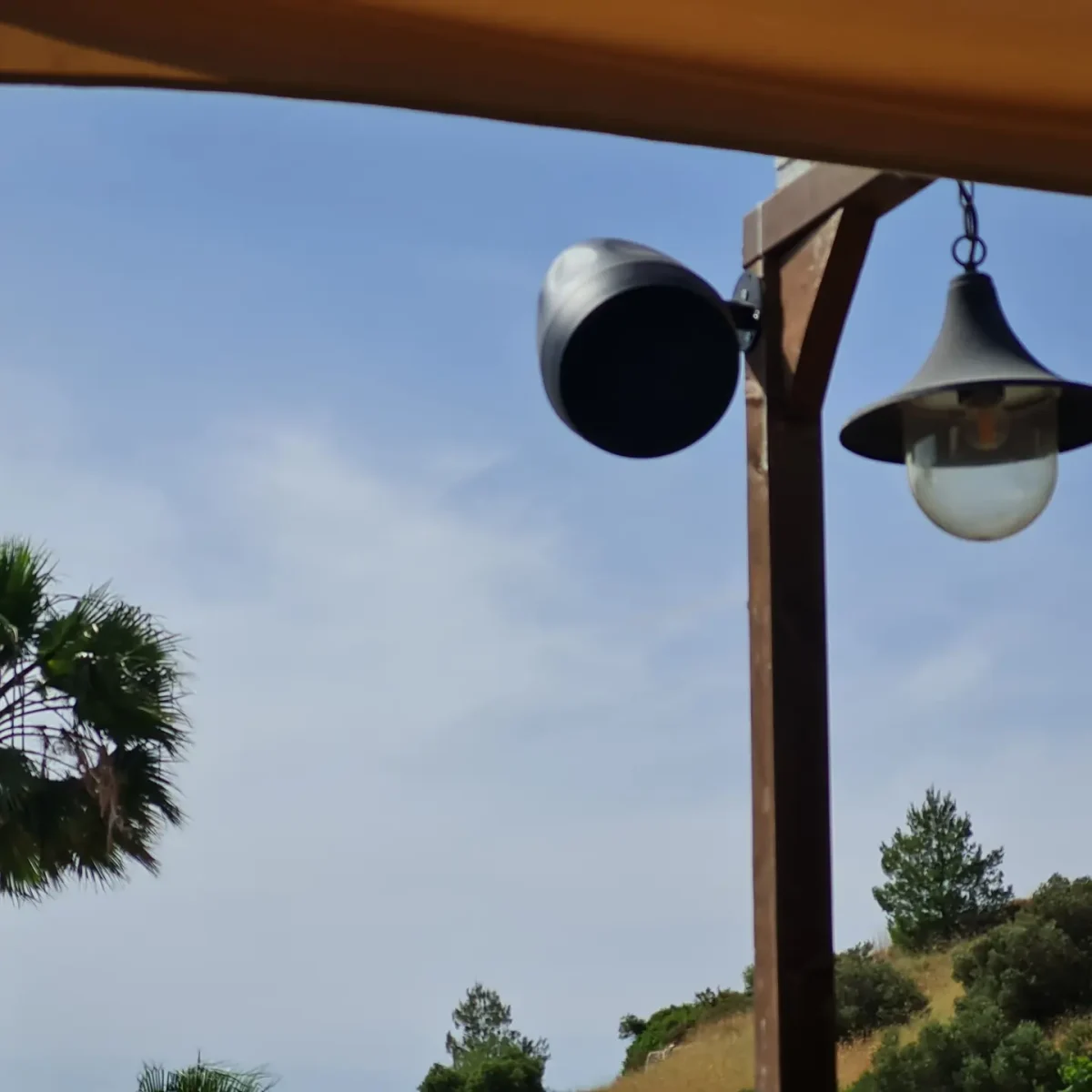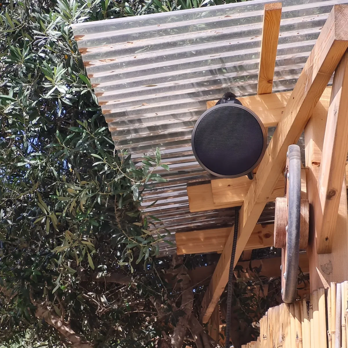 רמקולי גינה תלויים ומעוצבים בכל המתחם, חוויה של מוזיקה וכיף..