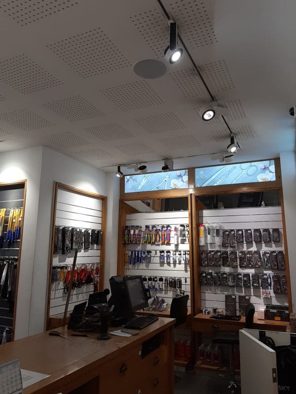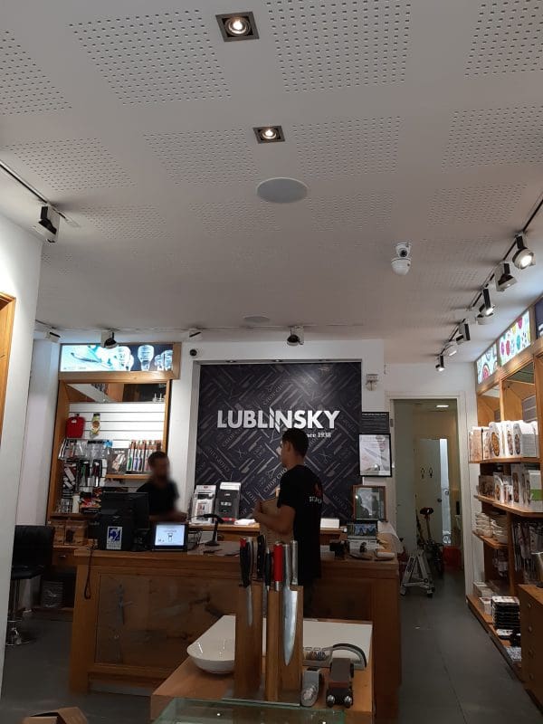 התקנת רמקולים שקועים בחנות לובלינסקי לסכינים בתל אביב.