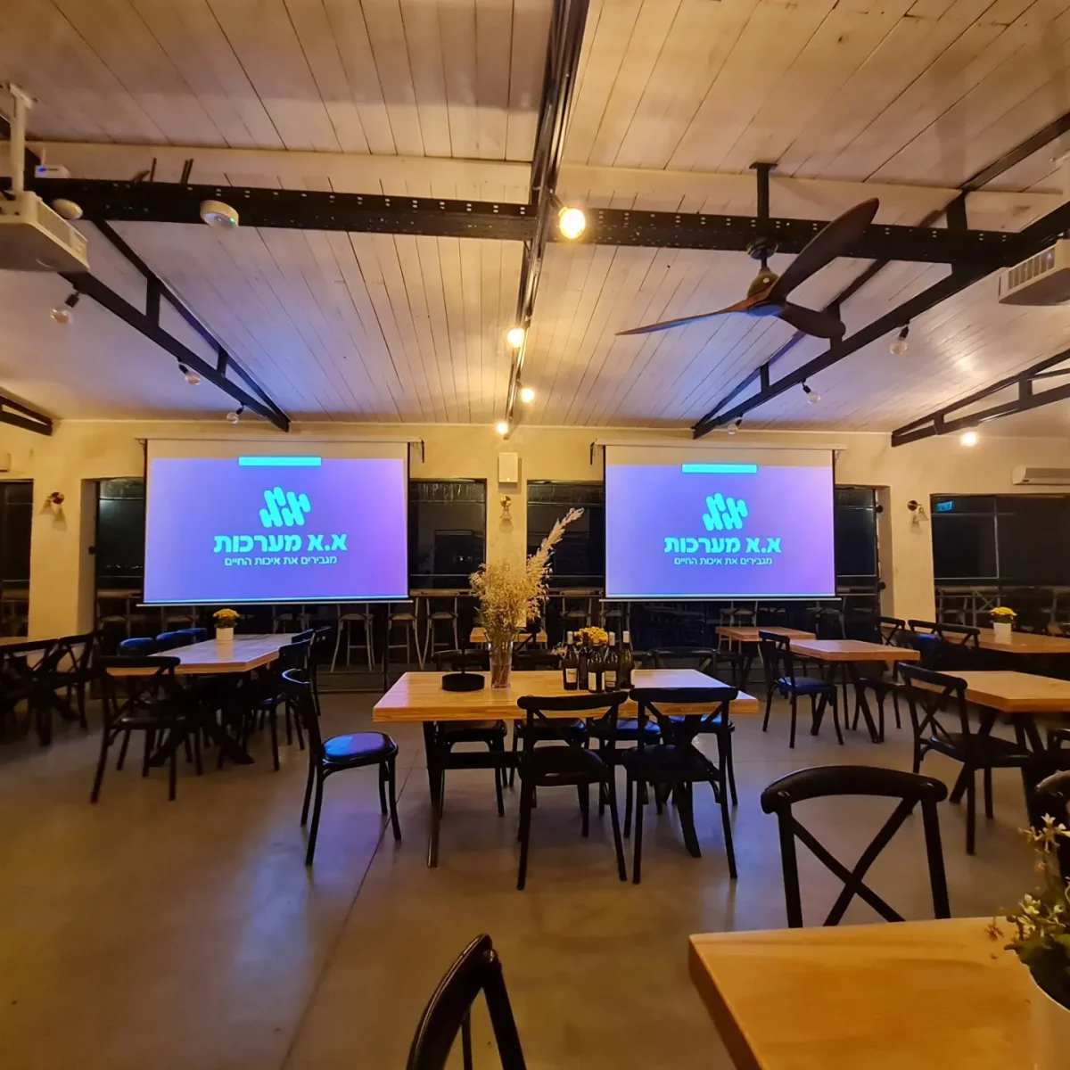 התקנת מערכת הגברה ומולטימדיה במתחם אירועים יקב אולו בגבעת ישעיהו… כלול רמקולים מבית Martin audio מקרנים עוצמתיים 6000 AL מסכי הקרנה ומערכות בקרה.